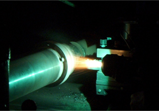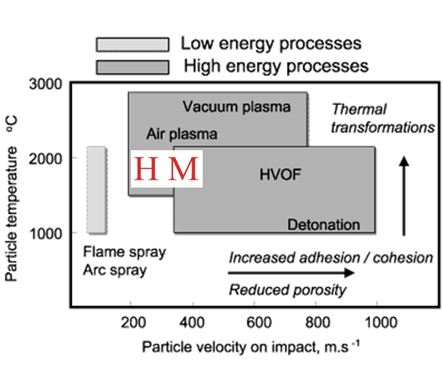 H.M与现有的热喷射方法比较时,是最具效率的热喷射方法,可以适用于耐磨损、耐腐蚀、耐热等所有领域。 喷射时的火焰速度为1200-1500m/sec,粒子的移送速度为500m/sec。H.M是同时具备了Arc Spray优势和H.V.O.F优势的喷射方法。